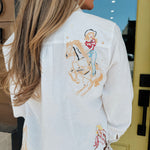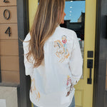 model is wearing size small. embroidered detail button down