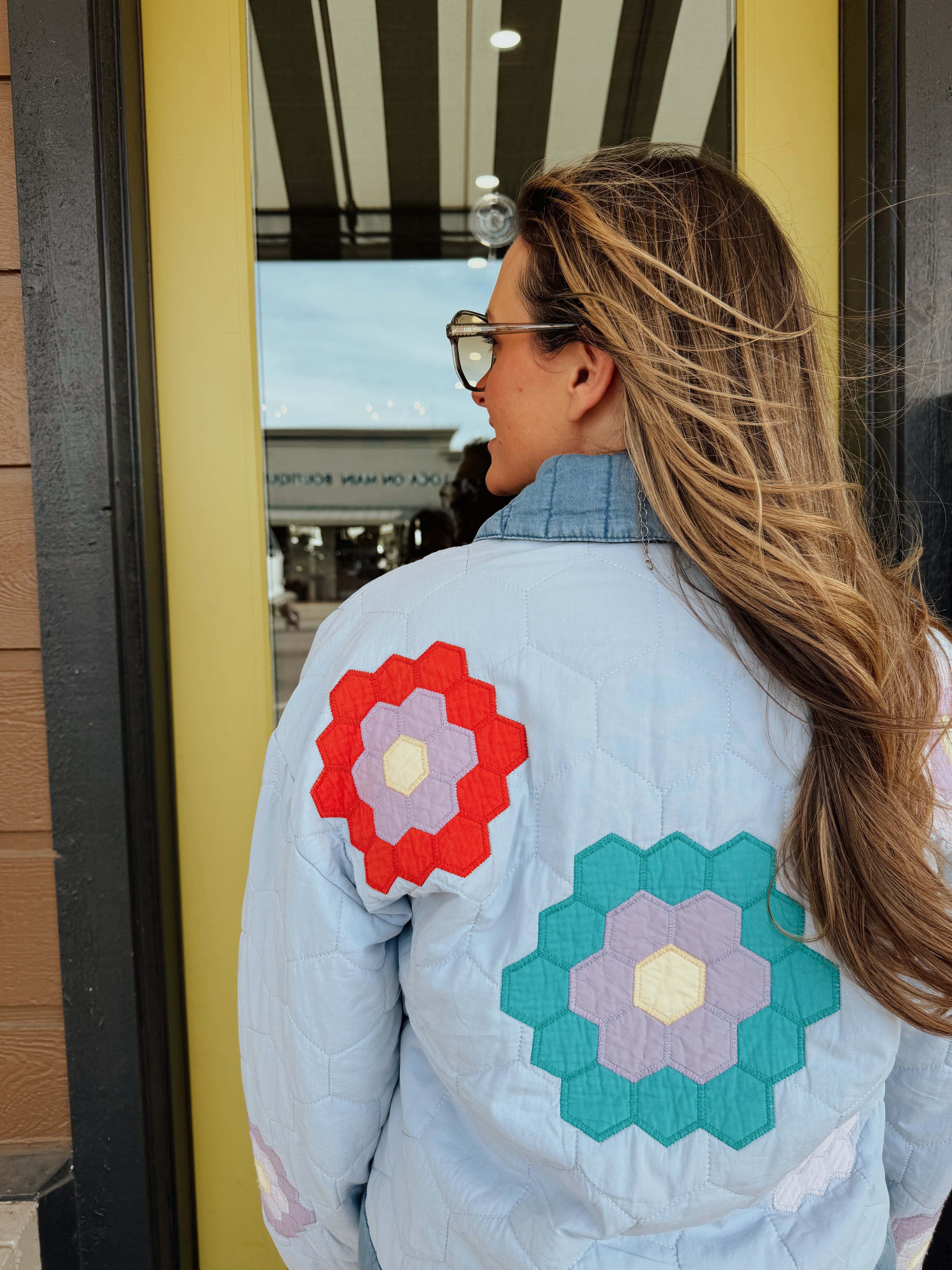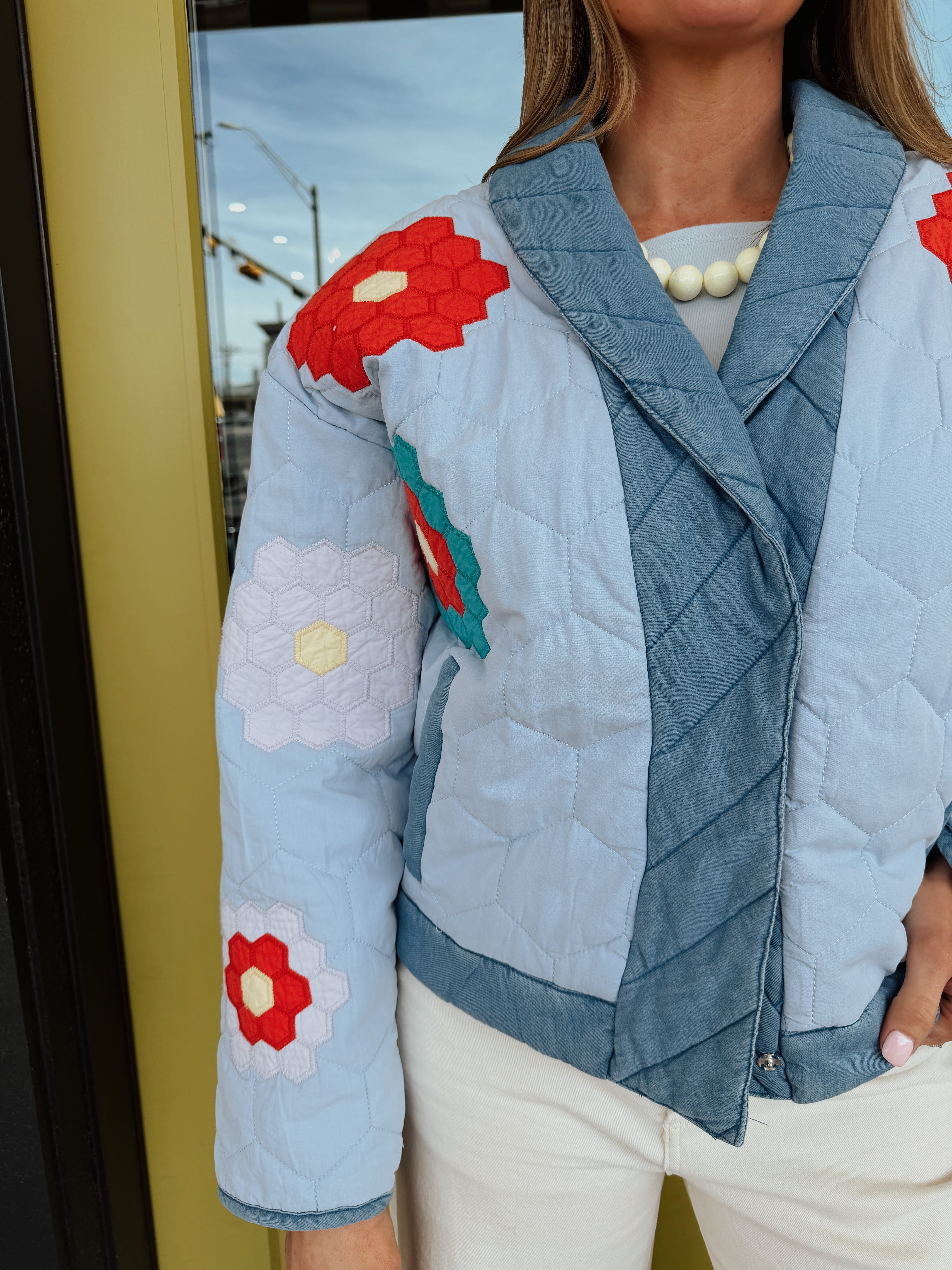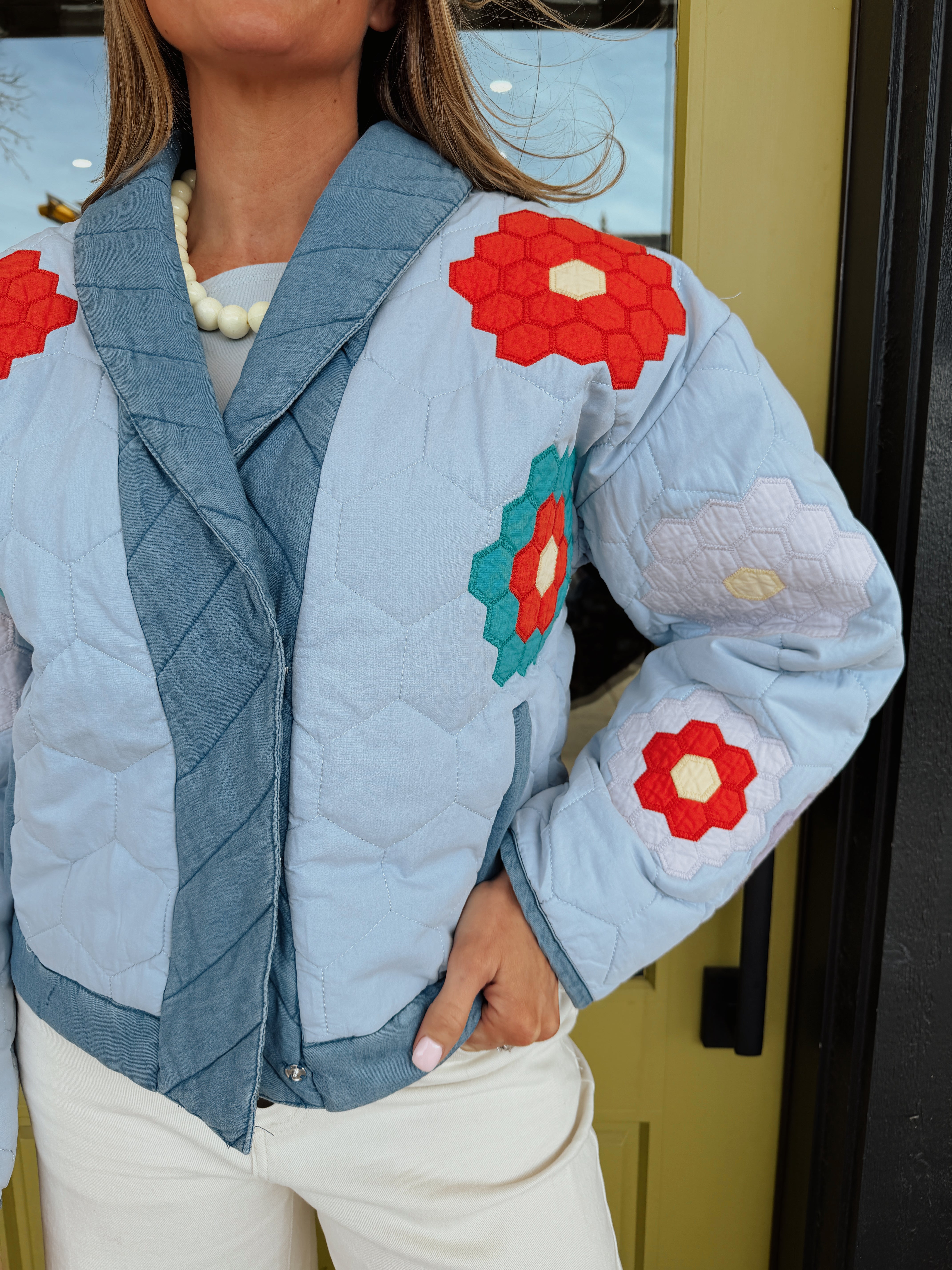 Too-cool in a quilted fabrication, this unique jacket is featured in a snap down style and colorful design with a shawl collared neckline and denim mix fabrication. Model wearing small