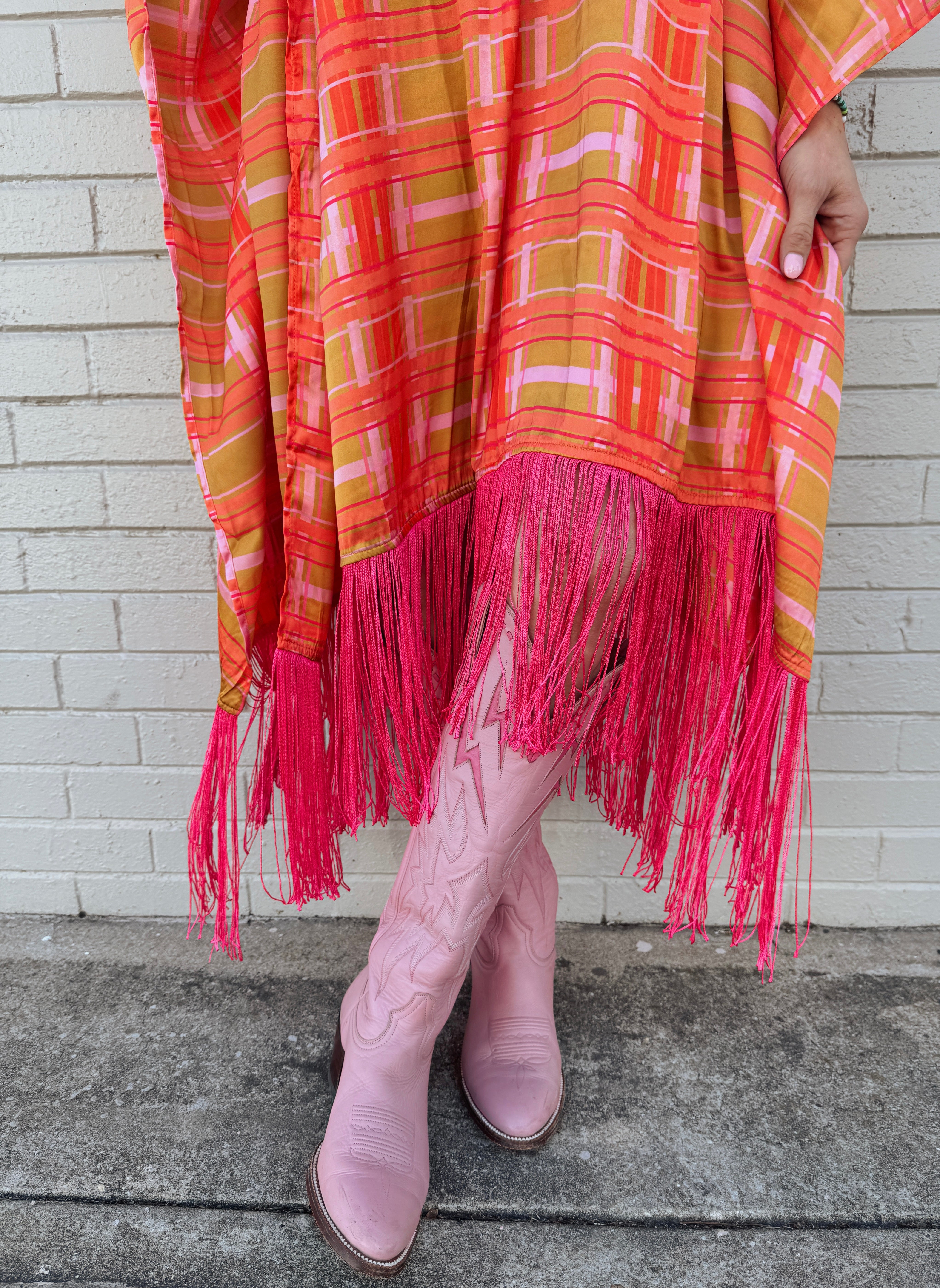 Laire Kaftan Mini This Kaftan nods to your favorite vintage pieces, featuring hand-drawn unique plaid fabric trimmed in fringe for some sass.