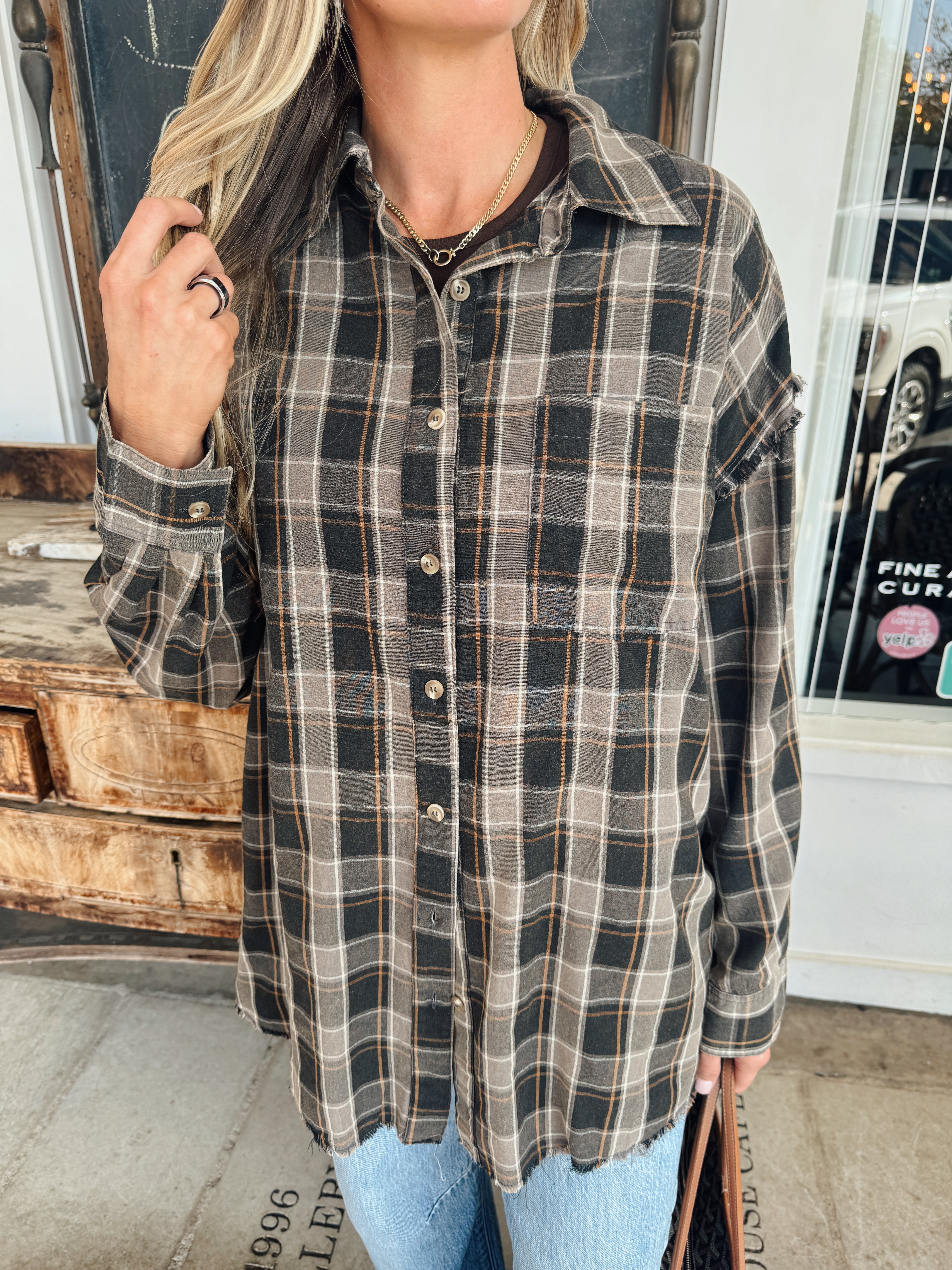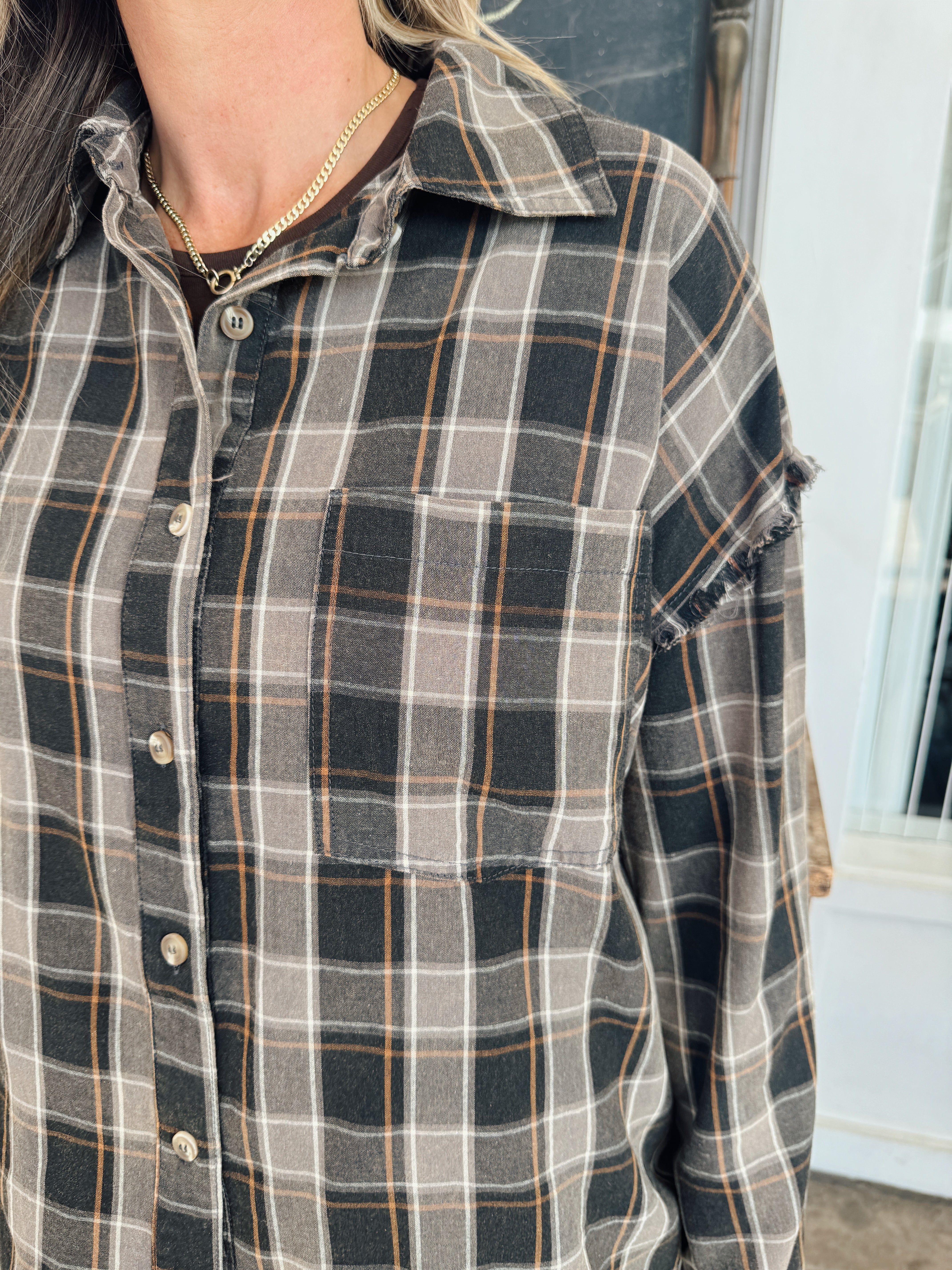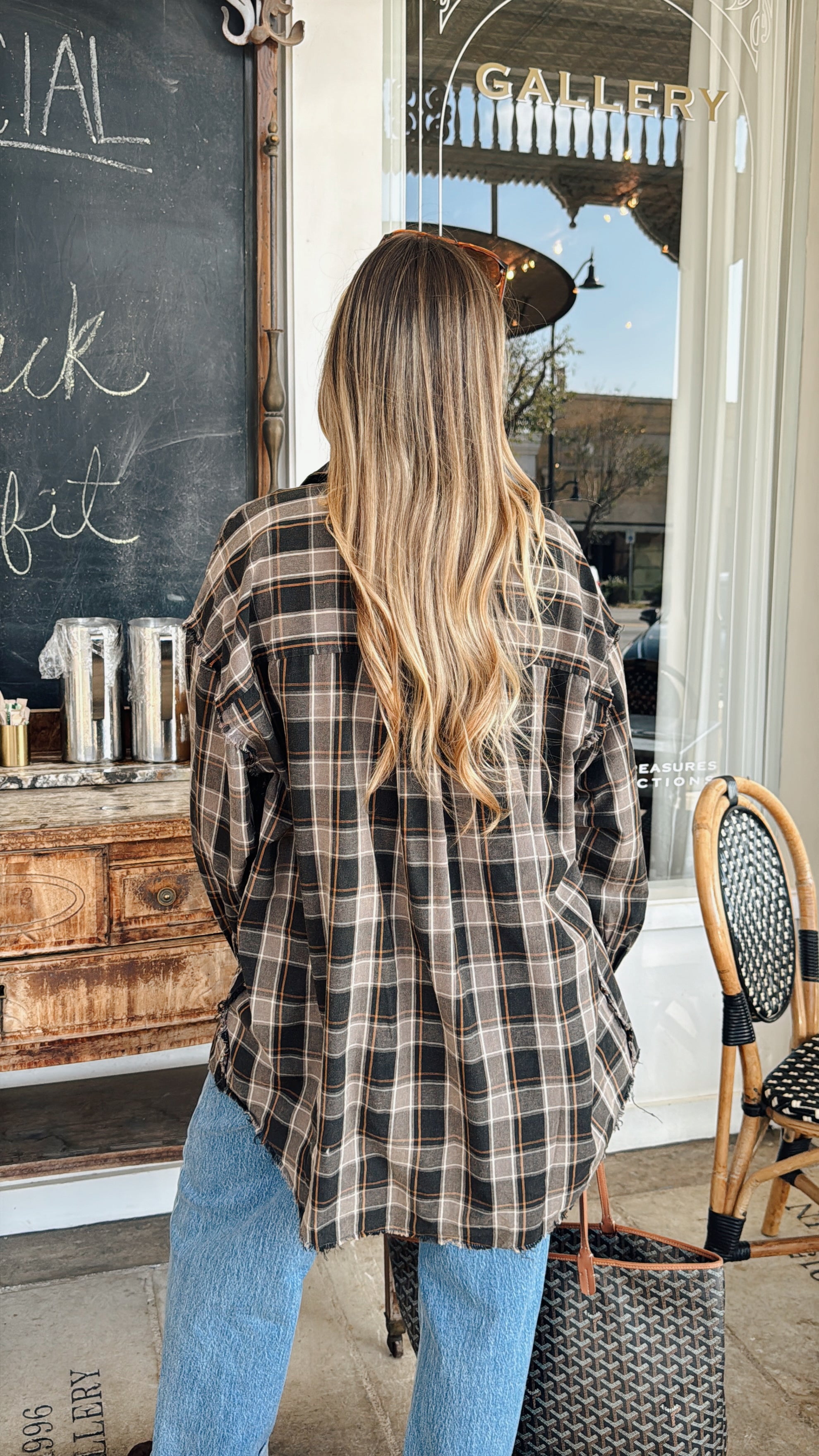 A woven plaid shirt with the following features: Collared neckline. Long sleeves with buttoned cuffs. Drop shoulder. Exposed shoulder seam with frayed raw edge. Button-front closure. Chest pocket. Pleated yoke back. Curved shirttail hem with frayed raw edge. Oversized fit. Model Info: Height: 5 ft 5in Wearing Size S.
