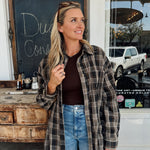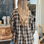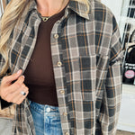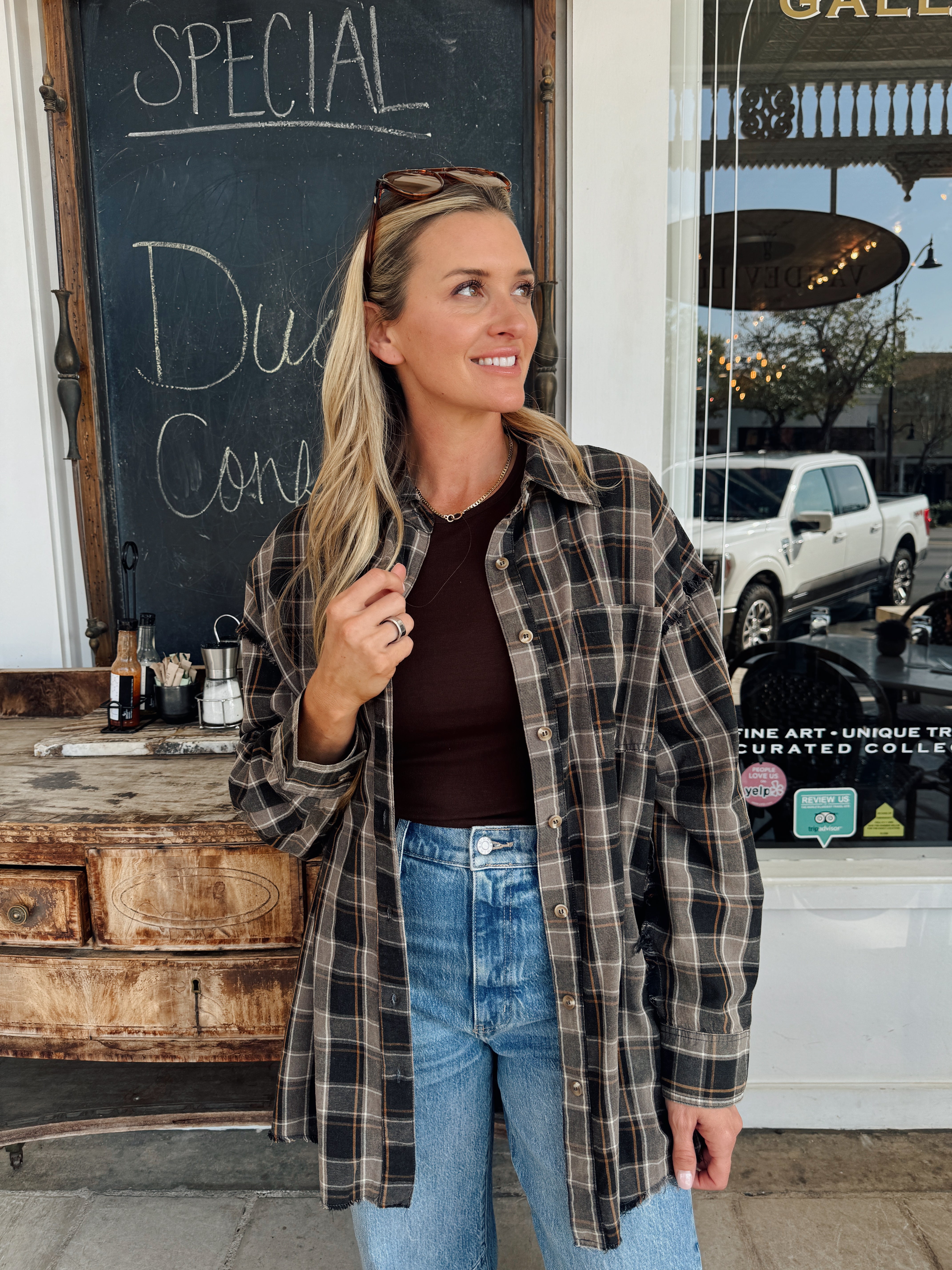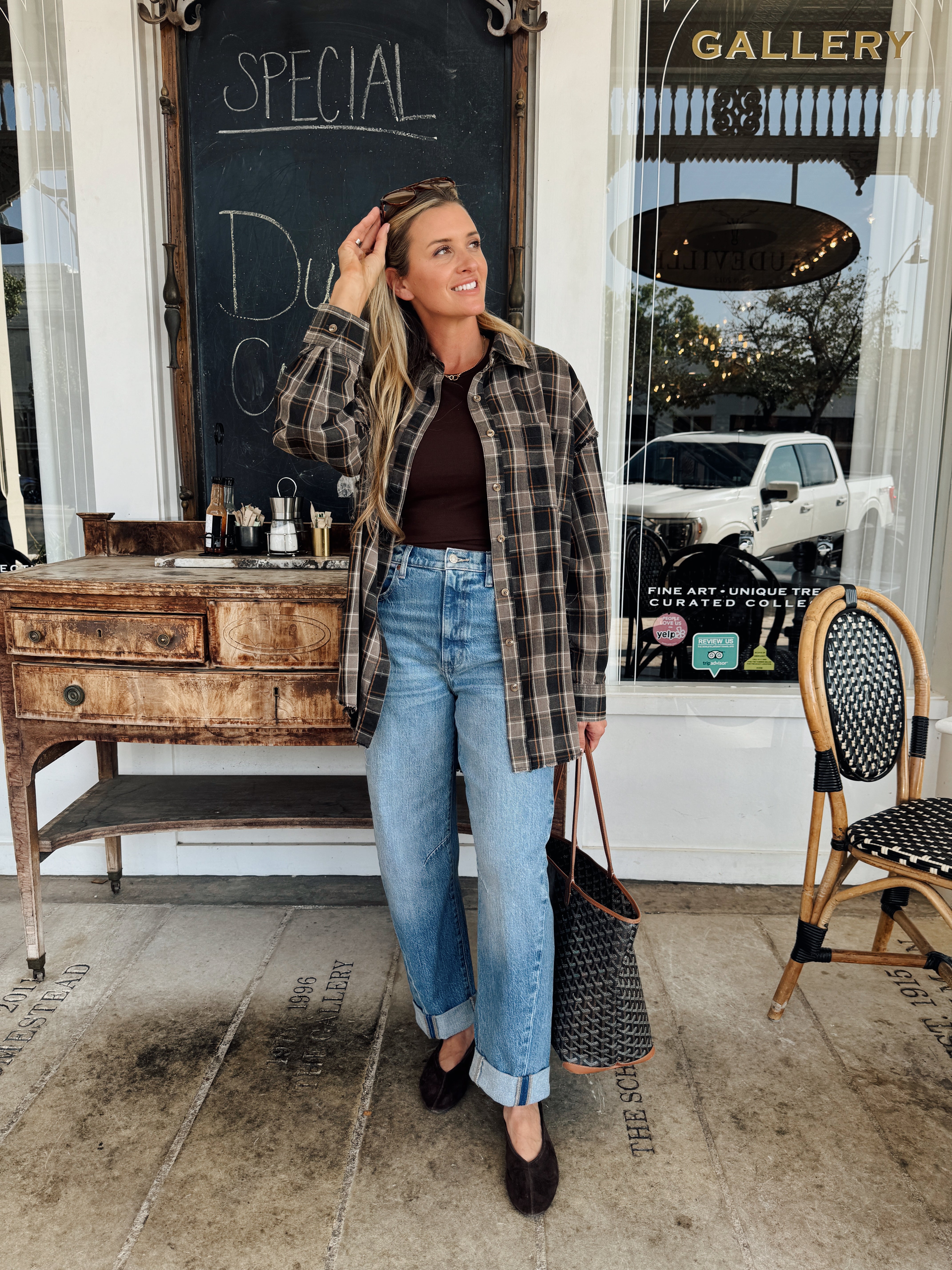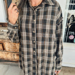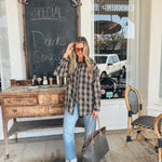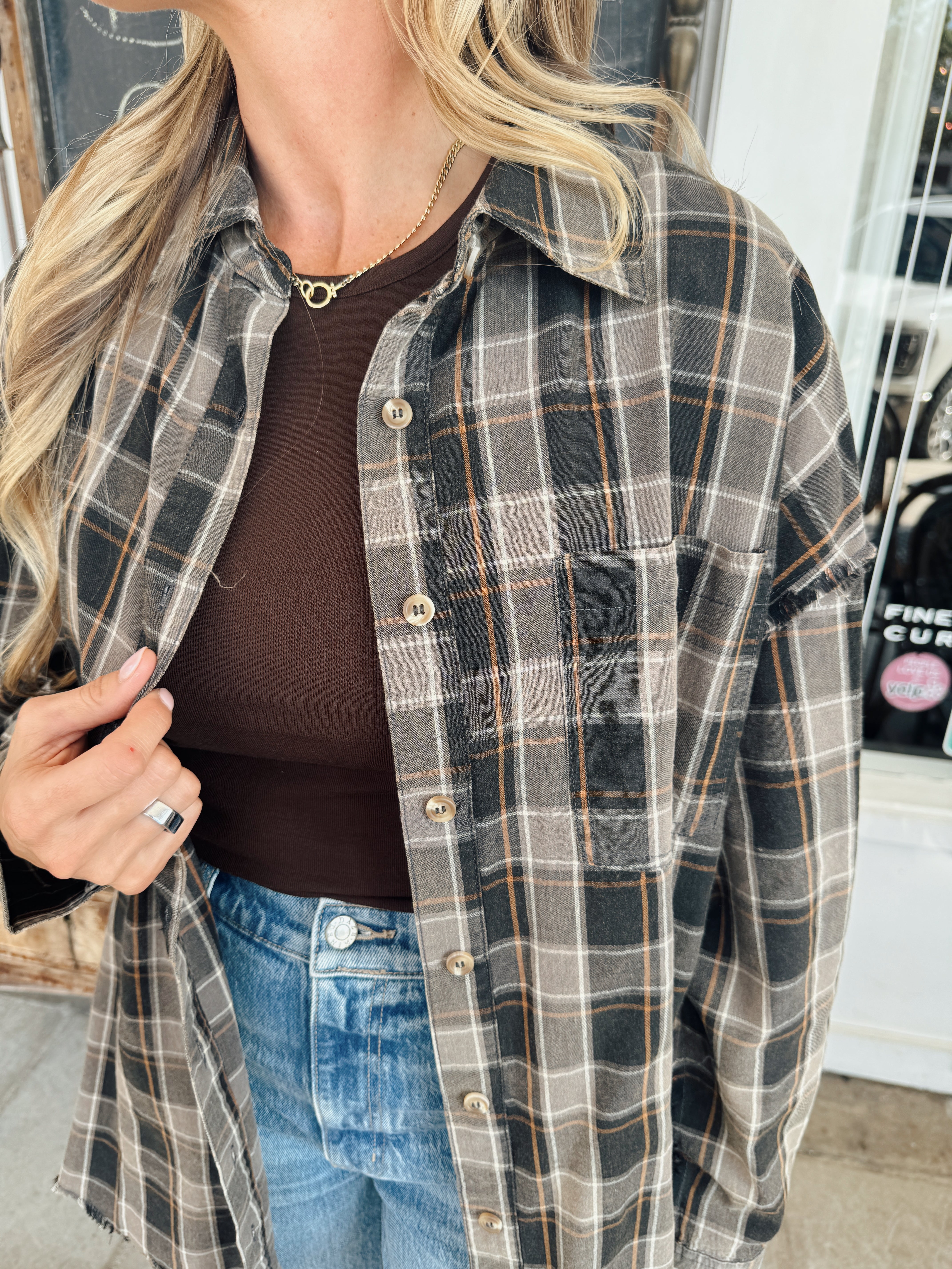 A woven plaid shirt with the following features: Collared neckline. Long sleeves with buttoned cuffs. Drop shoulder. Exposed shoulder seam with frayed raw edge. Button-front closure. Chest pocket. Pleated yoke back. Curved shirttail hem with frayed raw edge. Oversized fit. Model Info: Height: 5 ft 5in Wearing Size S.