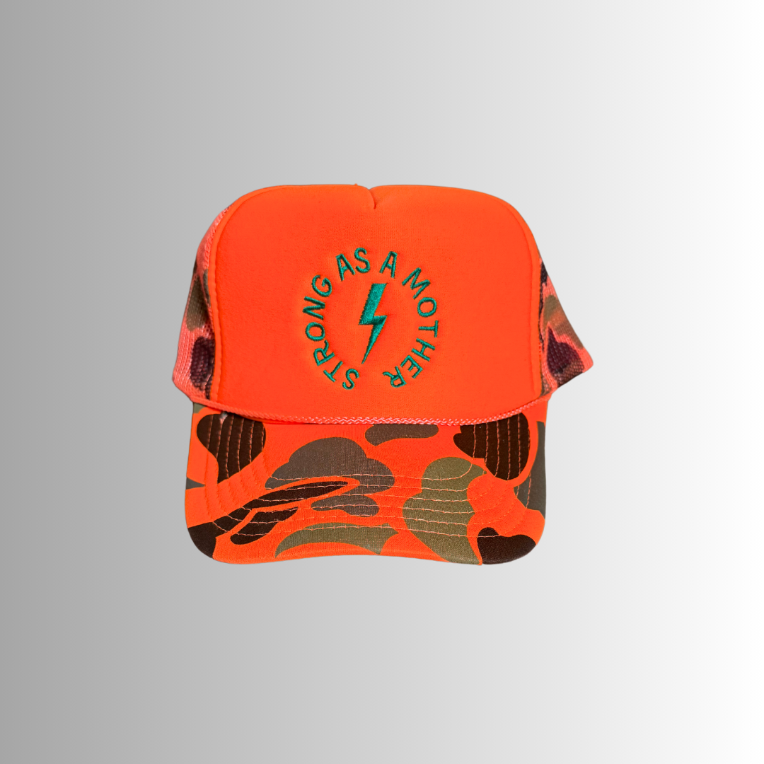The elevated version of your everyday hat. "Strong as a mother" is embroidered in green across our premium neon orange camo trucker hat. Wear this hat as a reminder of your incredible strength.