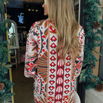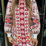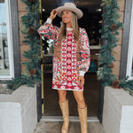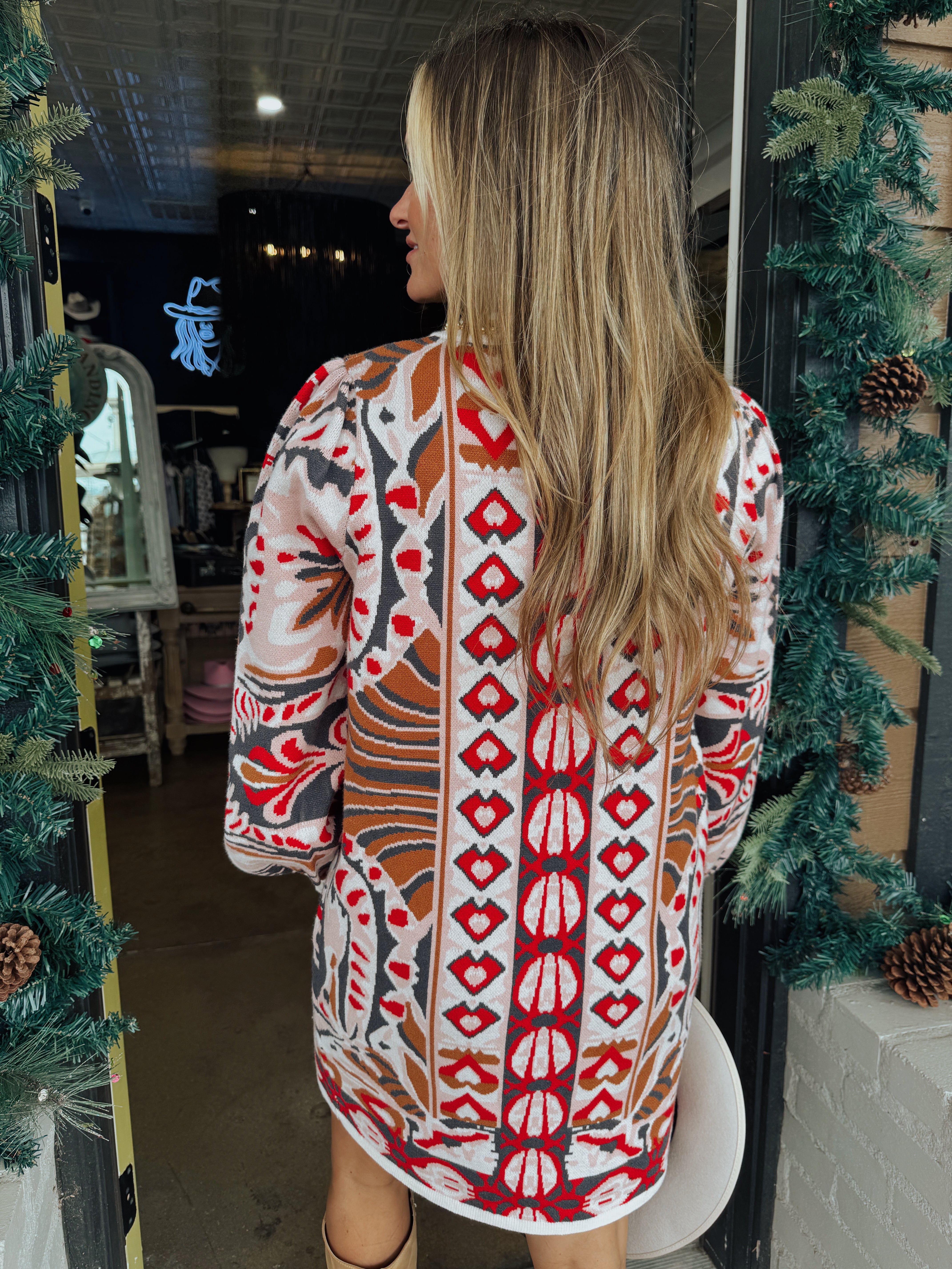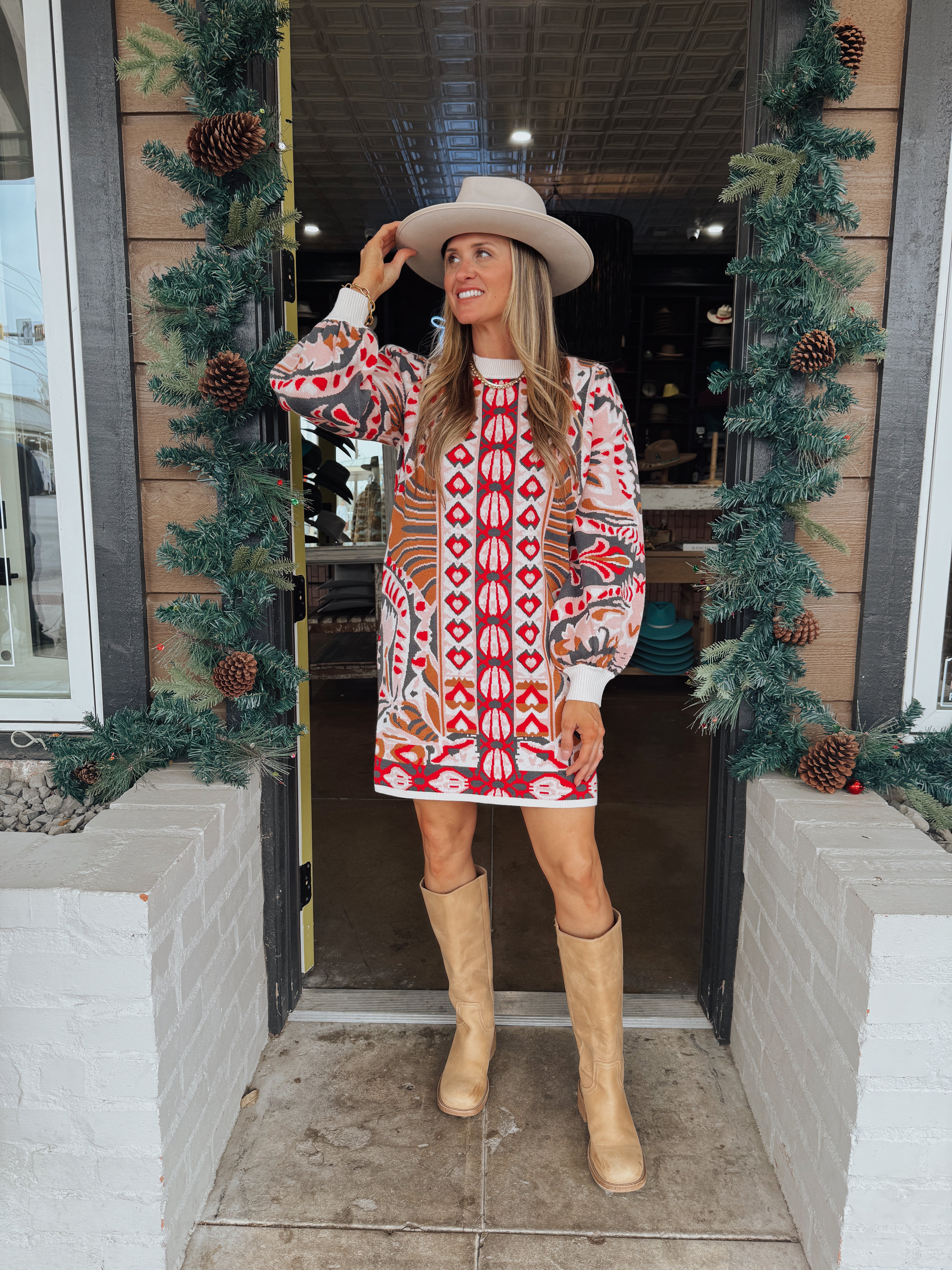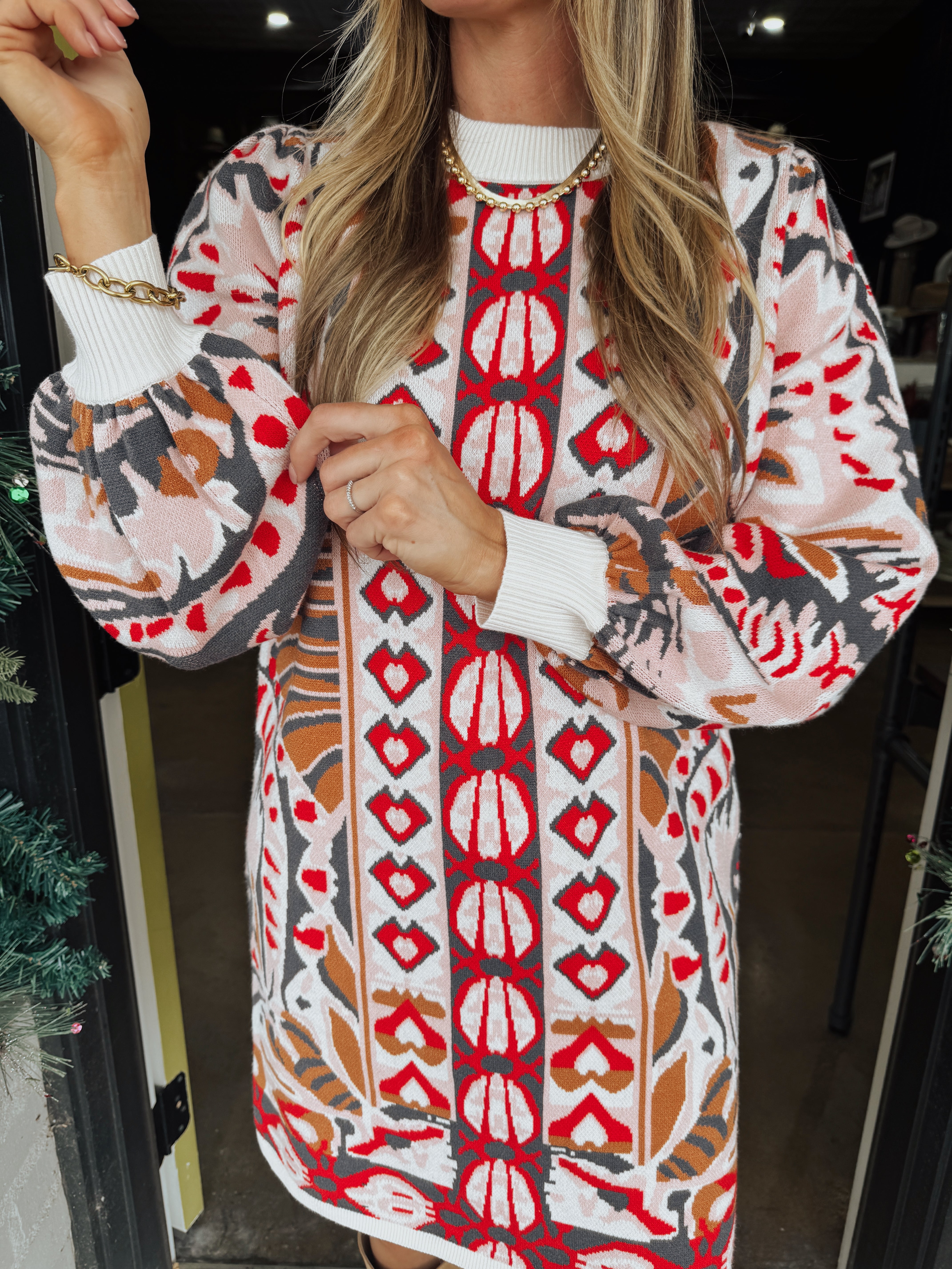 TRIBAL AND FLORAL MOTIF JACQUARD KNIT SWEATER DRESS 55%VISCOSE 45%NYLON MODEL HEIGHT: 5’9.5”